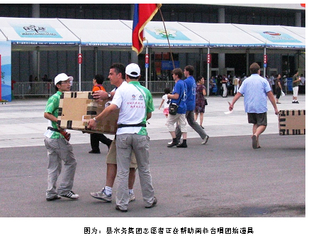 檢票口通道處突然出現(xiàn)個(gè)頭頂大箱的外國人,看他很吃力的樣子,隊(duì)員主動(dòng)向前提供幫助,經(jīng)過一番的交流,得知該團(tuán)隊(duì)是來自南非的合唱團(tuán),搬大箱子的是該團(tuán)的指揮,里面裝著的是南非民族樂器打鼓,是今天晚上表演的道具,隊(duì)員們將沉甸甸的大箱打鼓搬運(yùn)到了舞臺(tái)幕后。