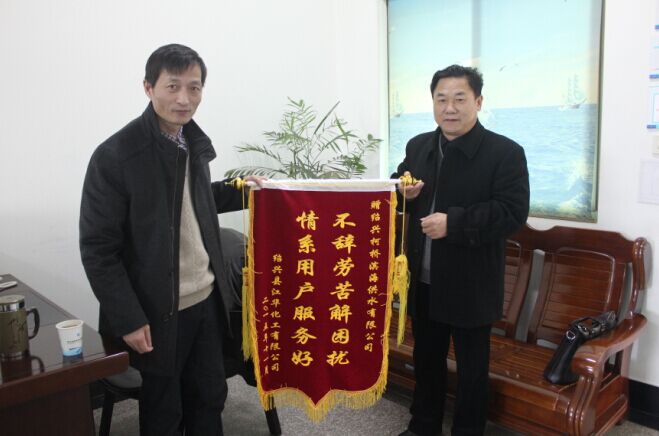 11月30日,紹興江華化工有限公司負責人來到公司,送來 “不辭辛勞解困擾,情系用戶服務好”的錦旗,對濱海供水公司長期以來為企業(yè)解決難題,營造良好的供水環(huán)境,提供高效的服務支持過程中表現(xiàn)出來的管理高水平、人員高素質、工作高效率表示深深感謝。